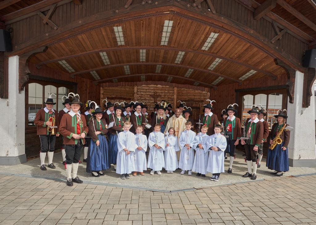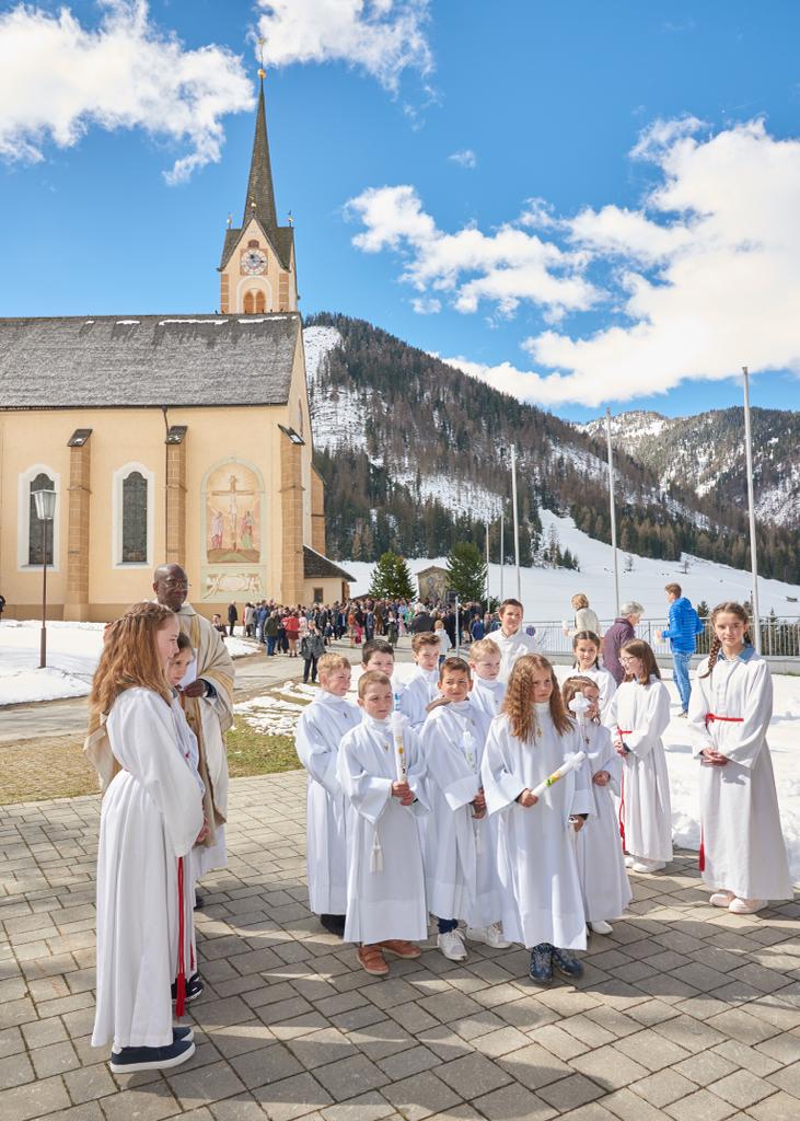 Am „Weißen Sonntag“ zogen die Erstkommunionkinder dann, begleitet von den festlichen Klängen der Bundesmusikkapelle Kartitsch gemeinsam mit ihren Familien und Paten vom Vereinshaus zum Festgottesdienst in die Kirche ein. Das Blau des Himmels, Sonnenschein und der Rest vom Schneefall drei Tage zuvor, sorgten zusätzlich für ein stimmungsvolles „Bild“. Zelebriert wurde die feierliche Messe von unserem Herrn. Pfarrer Dr. Vincent Ohindo.