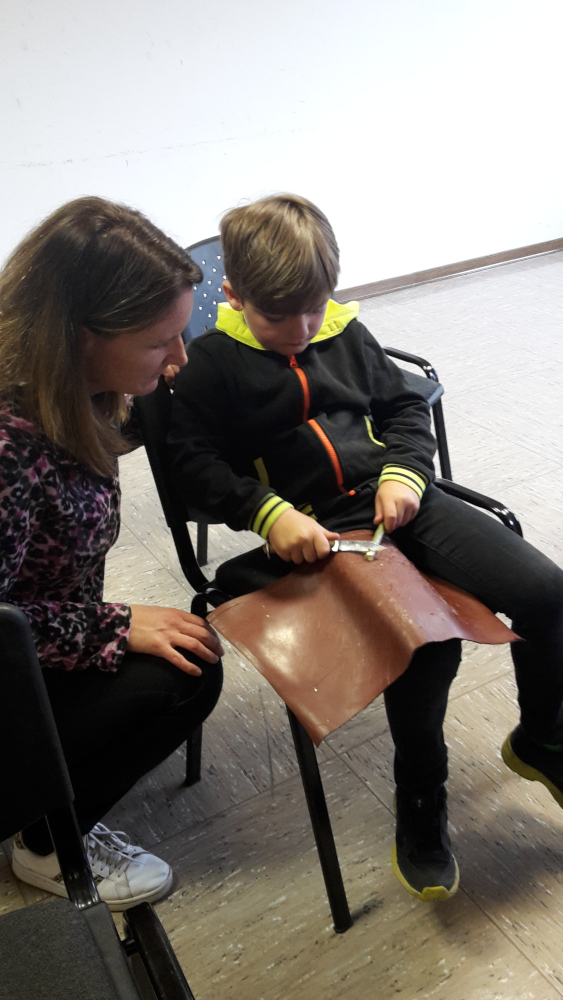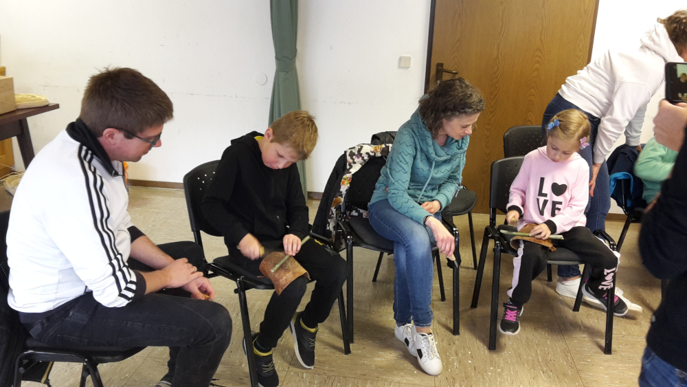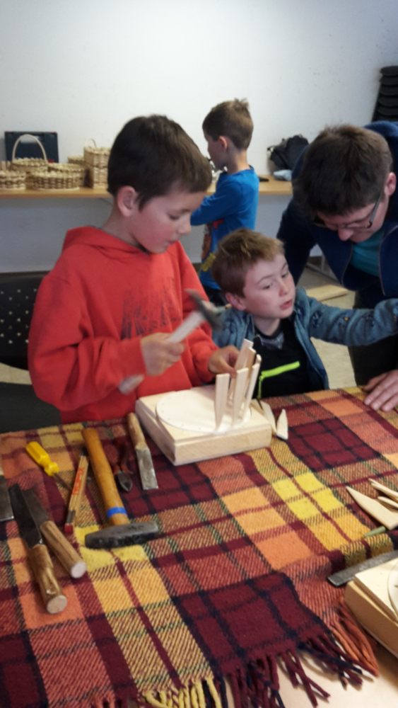 Unter Anleitung von Hans und mit Hilfe der Eltern legten die Kinder dann selber los. Ausgestattet mit Lederfleck am Oberschenkel und mit Messer wurde geschnitzt, geklopft, probiert, nachgebessert, …