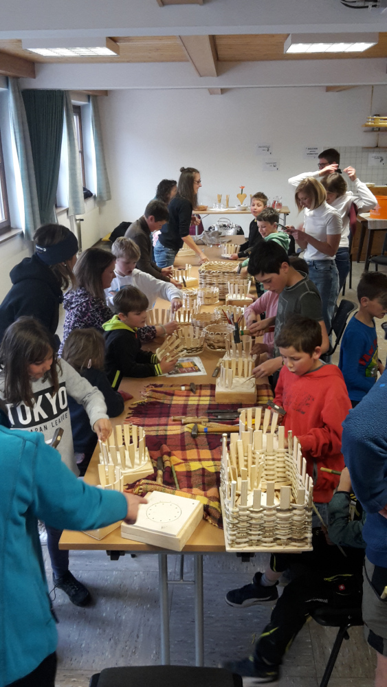 Wenn auch nicht jedes „Pfeifl“ beim ersten Versuch einen „richtigen Ton“ von sich gab – mit etwas Ausdauer konnte jedes Kind ein funktionierendes „Maipfeifl“ mit nach Hause nehmen.Besonderes Geschick bewiesen die Kinder dann auch beim Flechten. Einmal vorne, einmal hinten und dann wieder von vorne …
