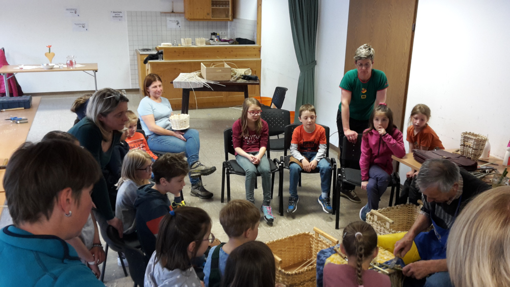 Damit die Herstellungsweisen nicht in Vergessenheit geraten, luden wir am 20. Mai 2023 zum gemeinsamen „Maipfeifl“ schnitzen und „Körbl“ flechten ein.