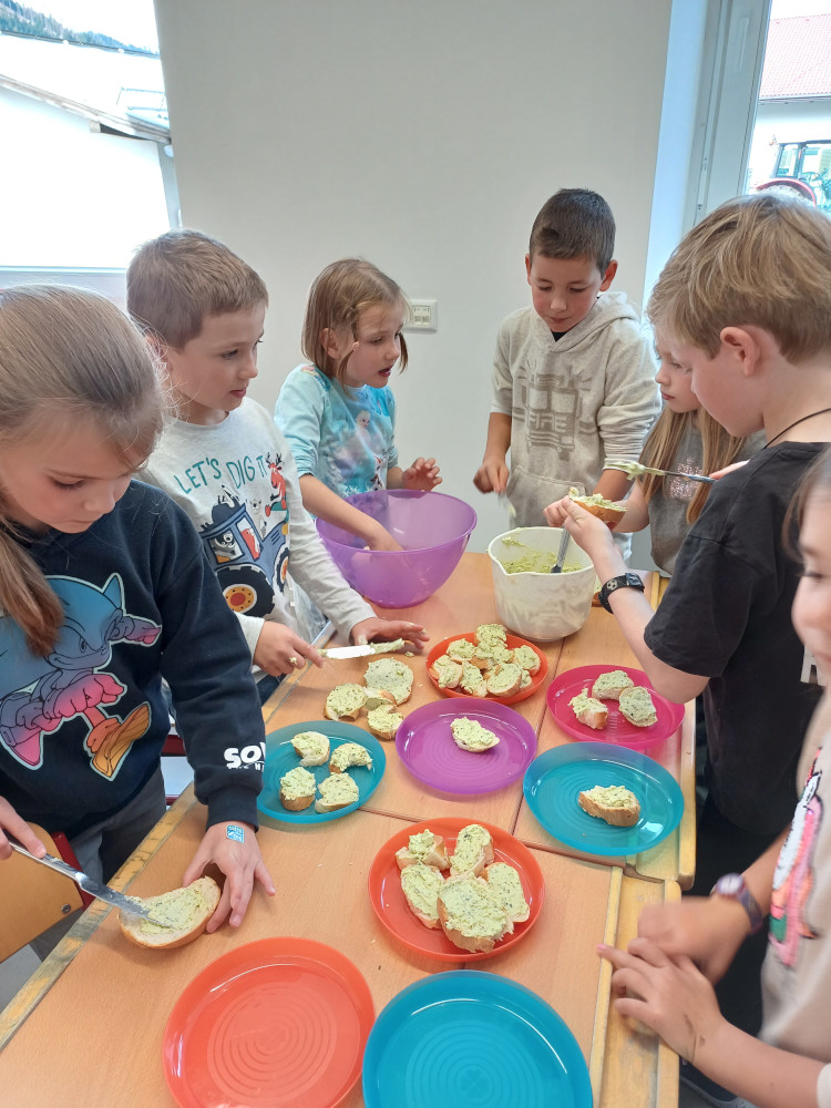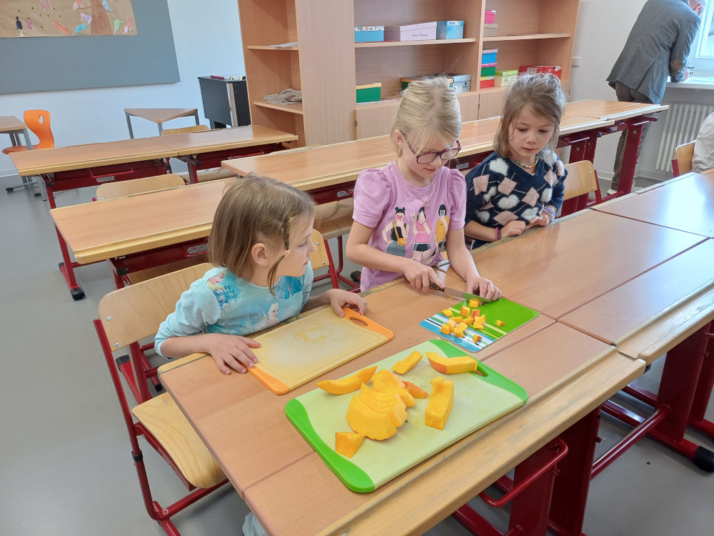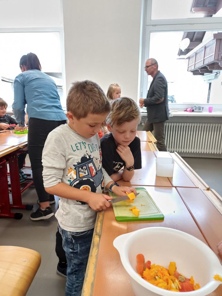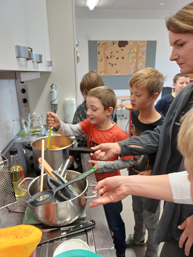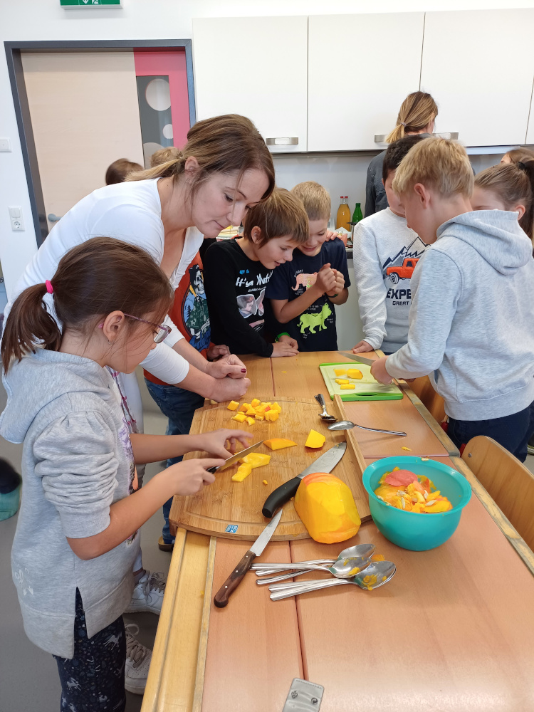 Mit viel Einsatz und Leidenschaft wurde von den Kindern geschält, geschnitten, zerkleinert, gemixt, püriert, gewürzt, probiert, und immer wieder mal ein Kürbiskern geknabbert, um zum Abschluss eine leckere Kürbissuppe und einen Kürbiskernaufstrich zu verköstigen.
