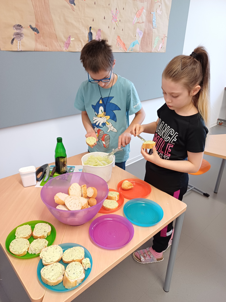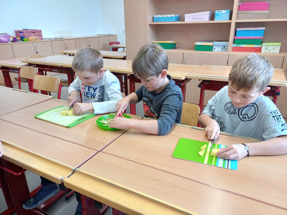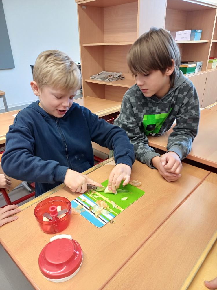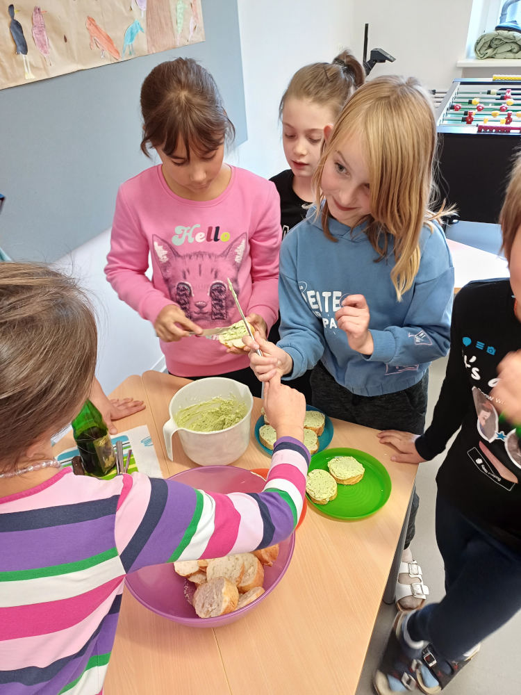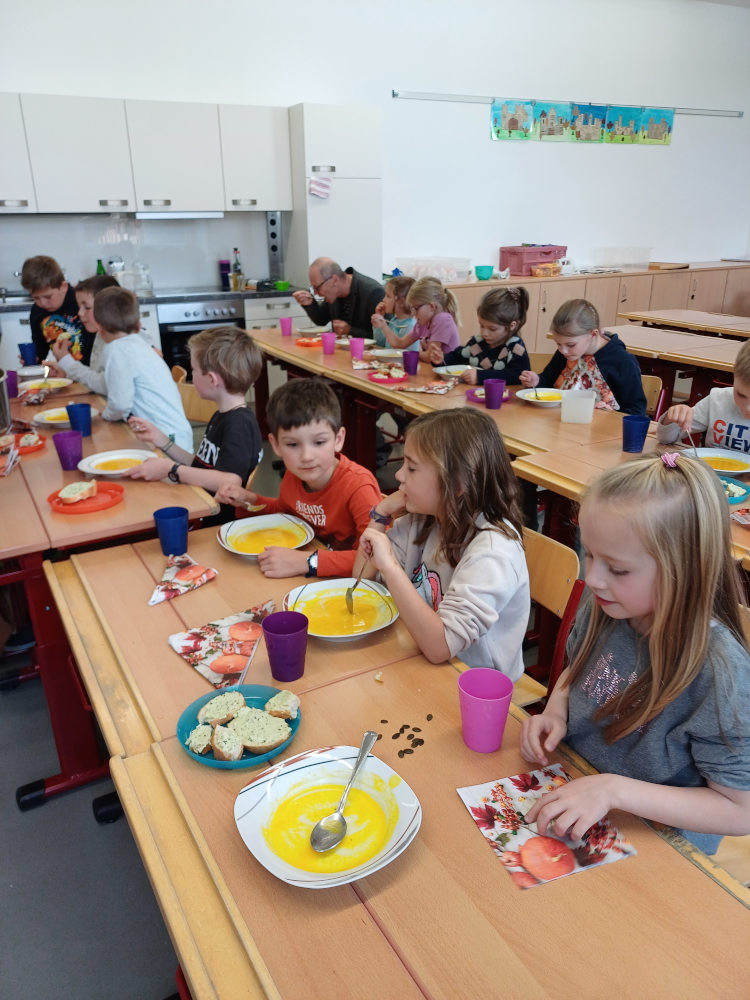 Mit viel Einsatz und Leidenschaft wurde von den Kindern geschält, geschnitten, zerkleinert, gemixt, püriert, gewürzt, probiert, und immer wieder mal ein Kürbiskern geknabbert, um zum Abschluss eine leckere Kürbissuppe und einen Kürbiskernaufstrich zu verköstigen.
