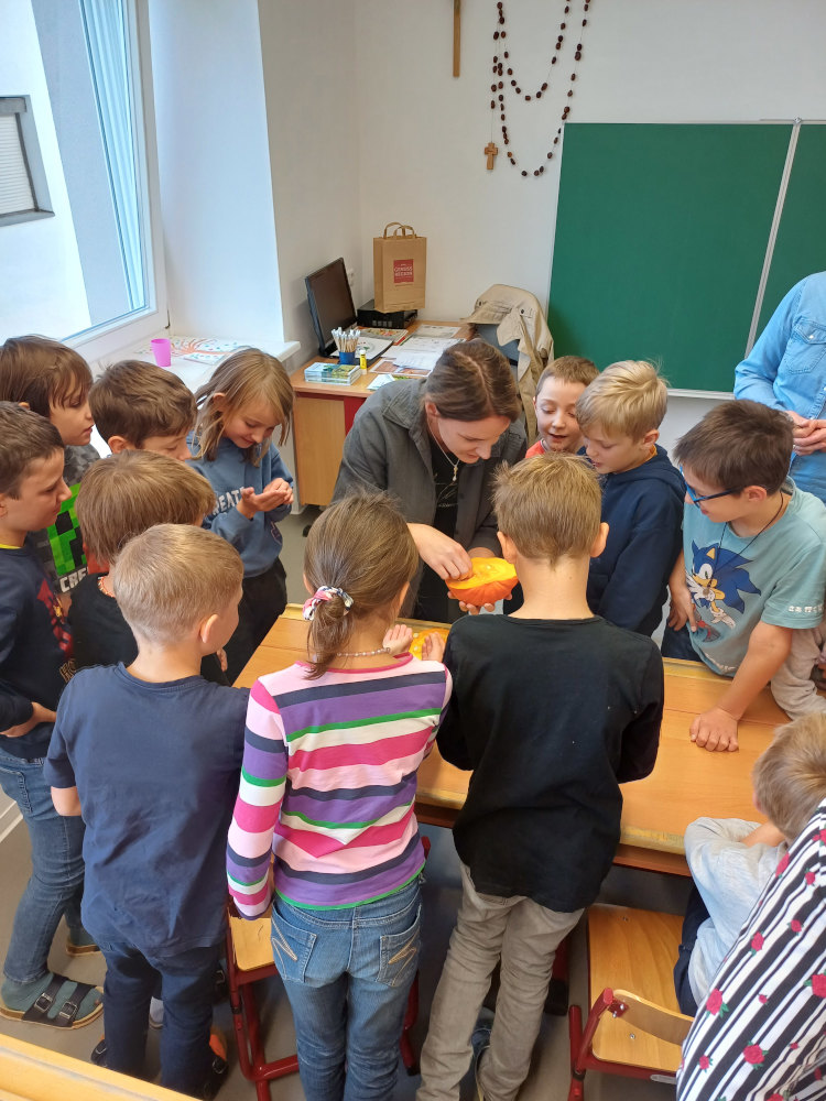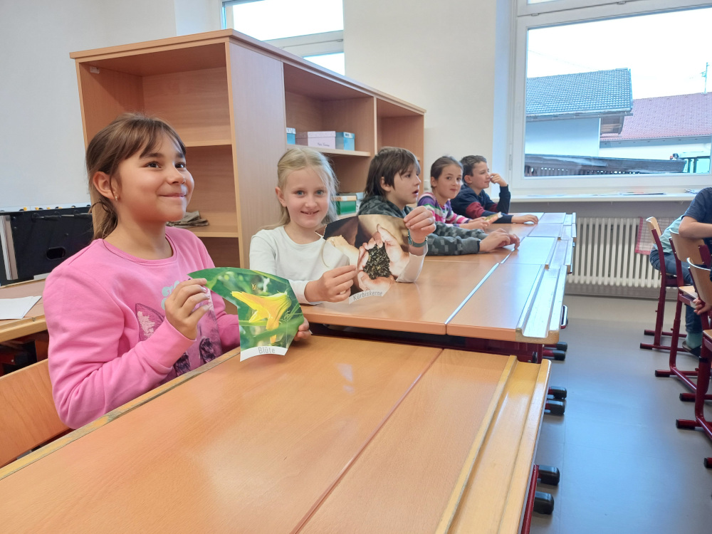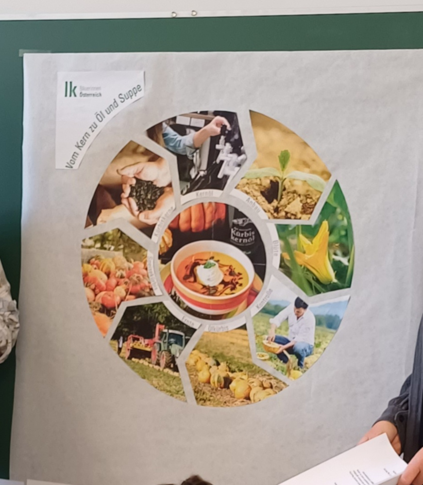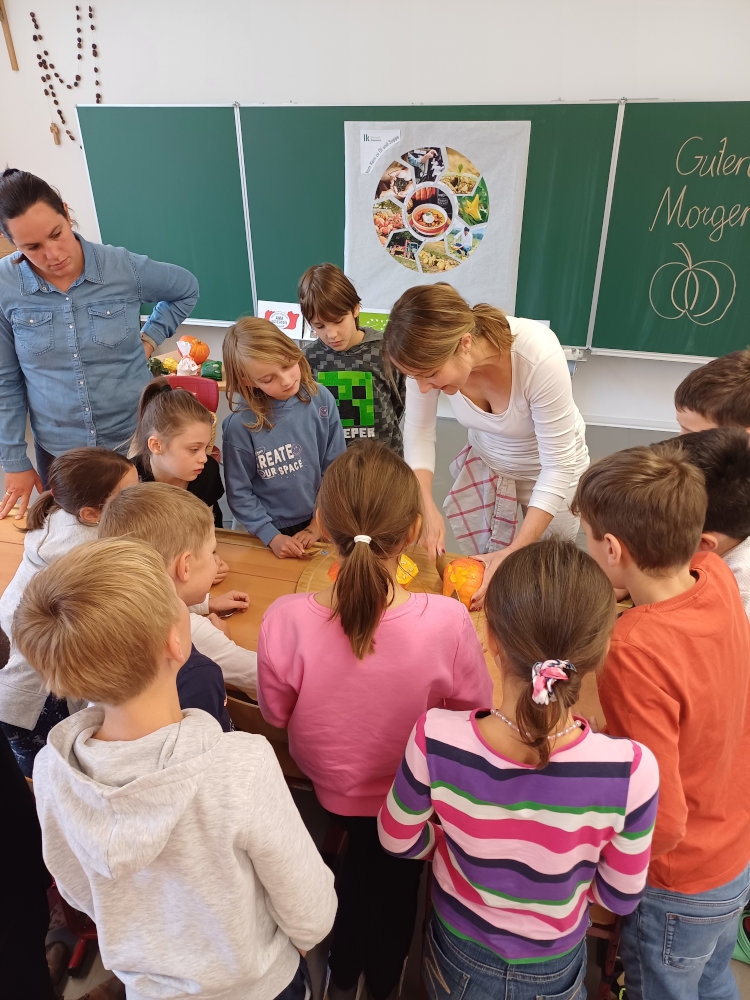 Die Kinder waren begeistert und interessiert dabei. Lernten verschiedene Arten von Kürbissen kennen und punkteten mit ihrem Wissen um deren Verwandte. Was ein Kern zum Keimen und die Pflanze zum Wachsen braucht konnte ohne große Probleme beantwortet werden. Aber wie erkennt der „Kürbis-Bauer“ wann ein Ölkürbis reif ist, für was braucht es einen Kürbisschieber und wie funktioniert eigentlich die Erntemaschine? Gemeinsam mit den Schüler:innen „erarbeiteten“ wir den Weg der Öl-Kürbisse vom Kern zum wertvollen Öl. Dass die Speisekürbisse nach wie vor händisch geerntet werden müssen, leuchtete ein: denn sonst würden sie ja kaputt gehen, war die Antwort.