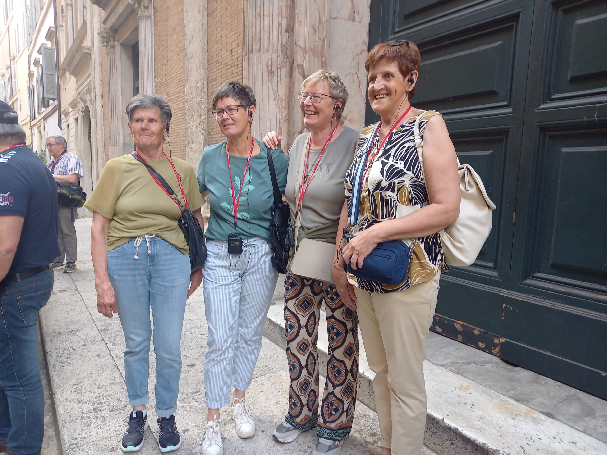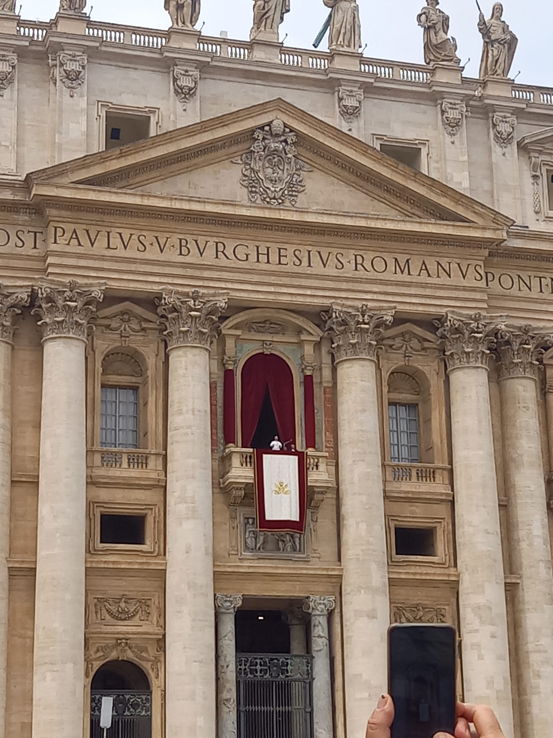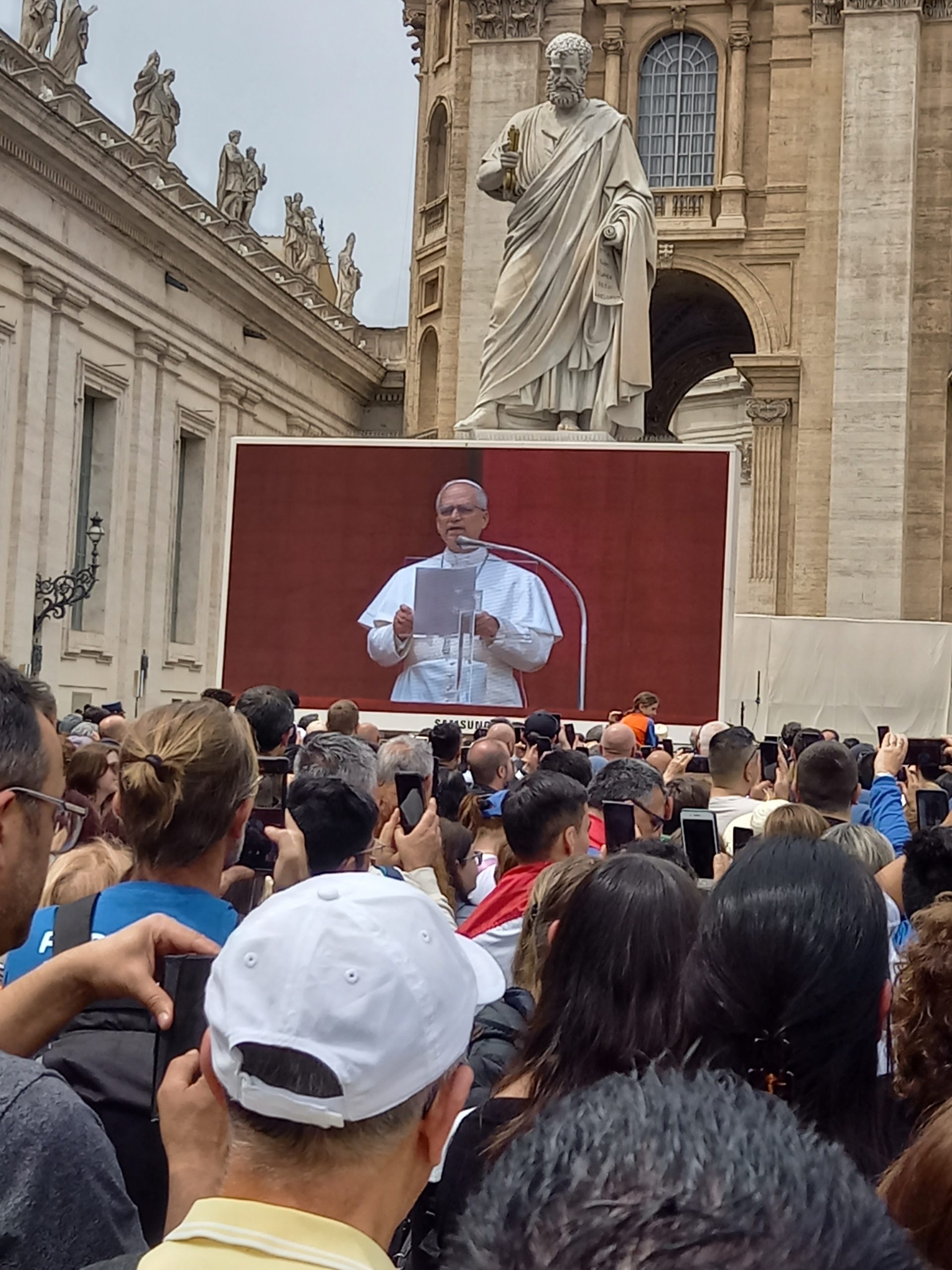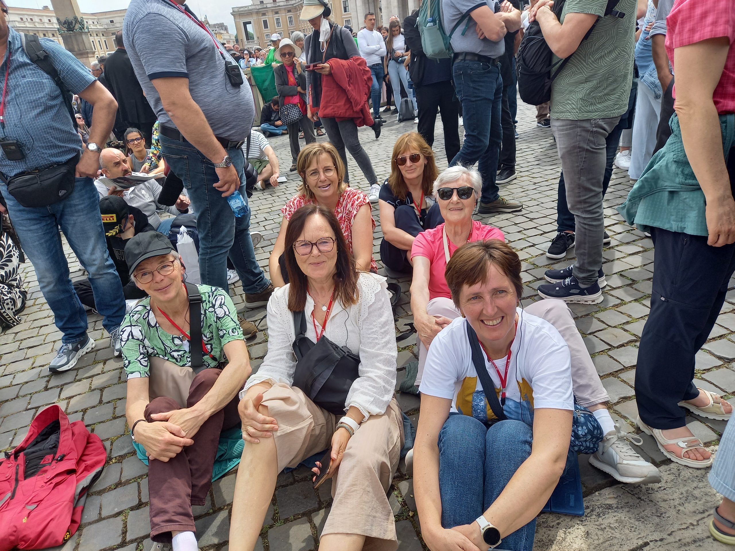 Nach einem intensiven und beeindruckenden Programm am Samstag, machte sich die Gruppe am Sonntag, 11. Mai, zugleich Muttertag, auf zum Petersplatz, um das Angelusgebet mit dem neuen Papst mitzuerleben. Punkt 12 Uhr ging der rote Vorhang der Loggia vom Petersdom auf und Leo XIV. erschien am Balkon, begleitet vom Jubel zehntausender Gläubiger. Seine Botschaft war dieselbe wie bei seiner Wahl vor wenigen Tagen: Der Krieg muss aufhören! FRIEDEN soll überall dort werden, wo Krieg herrscht.
