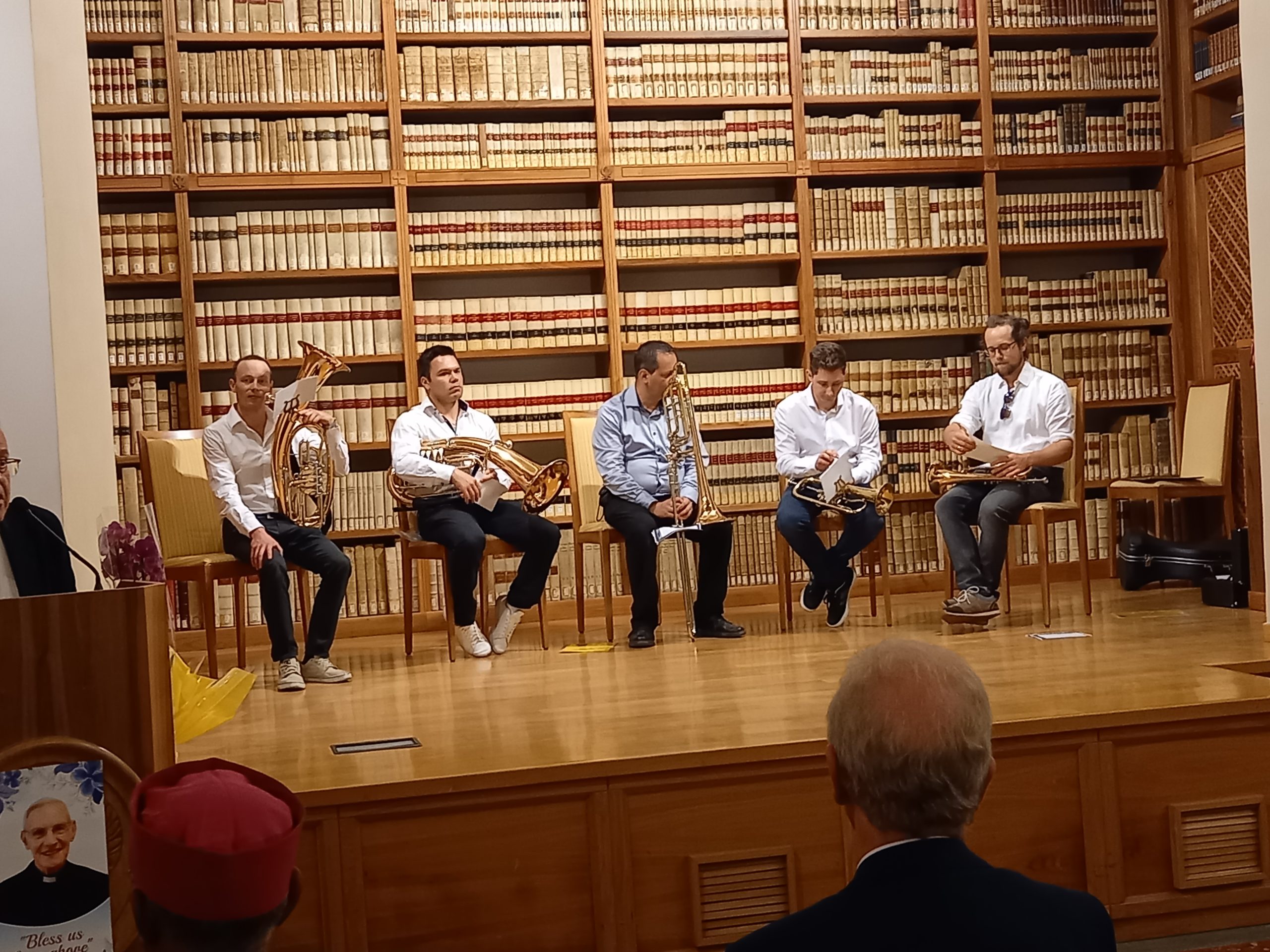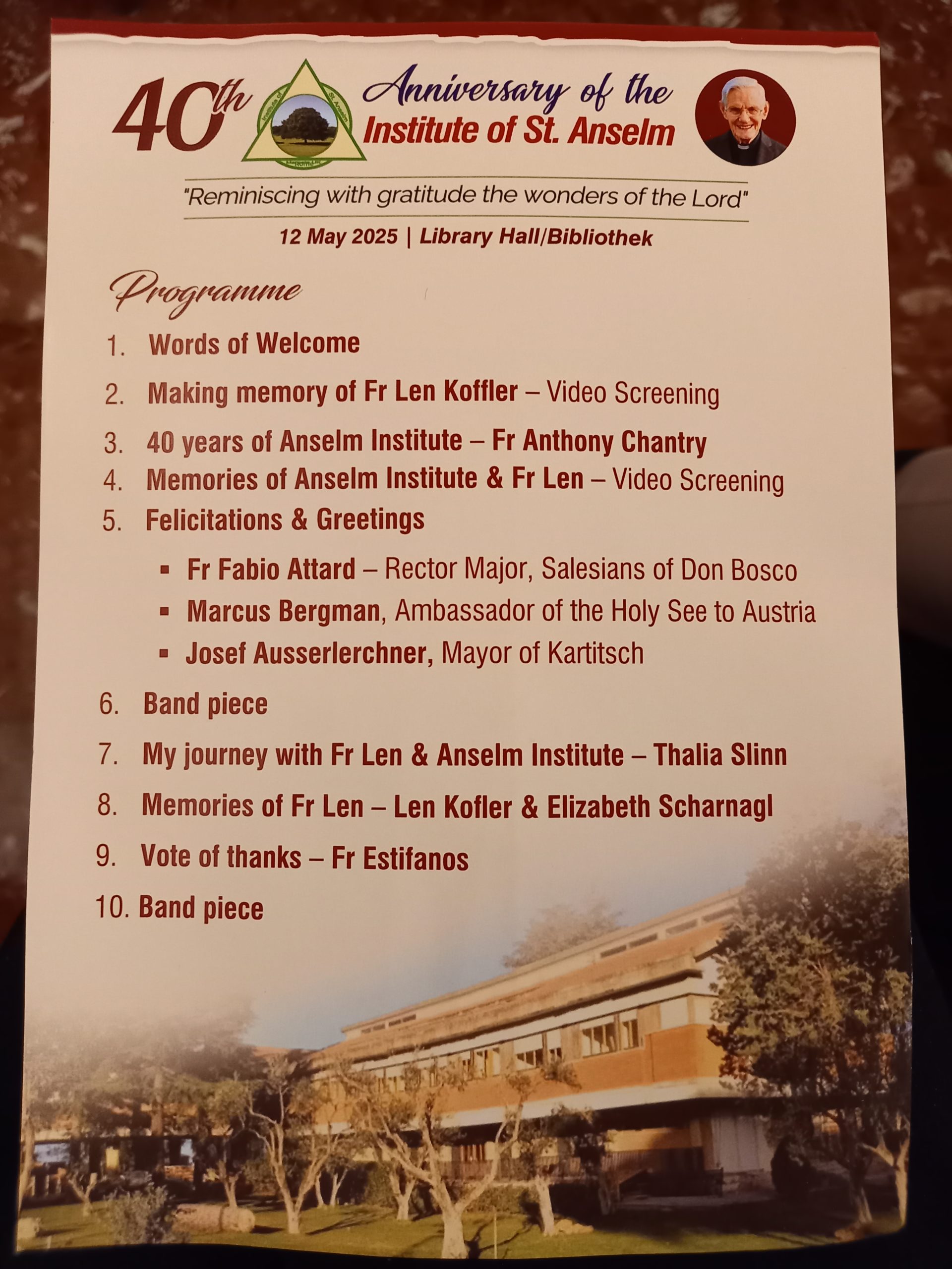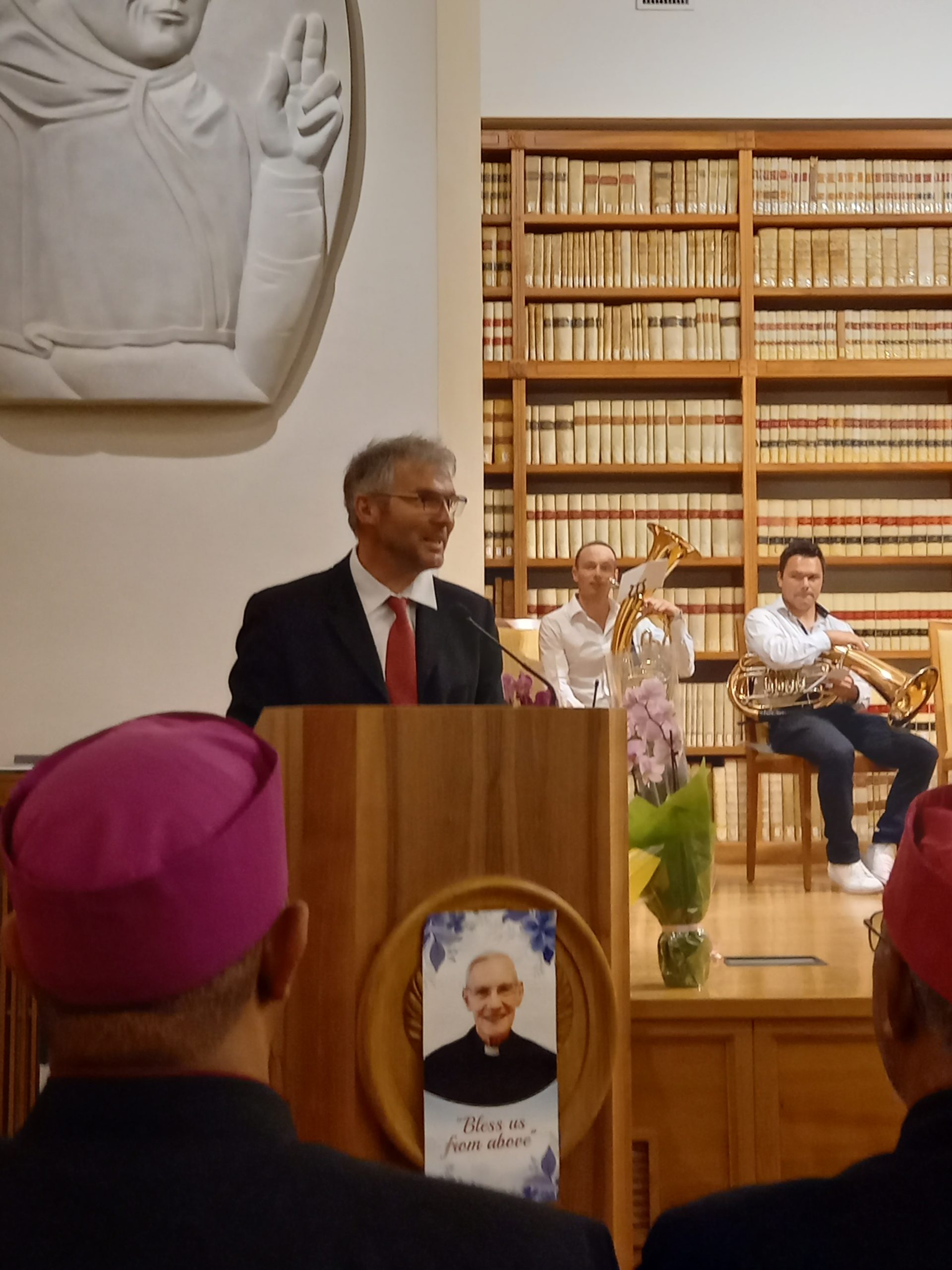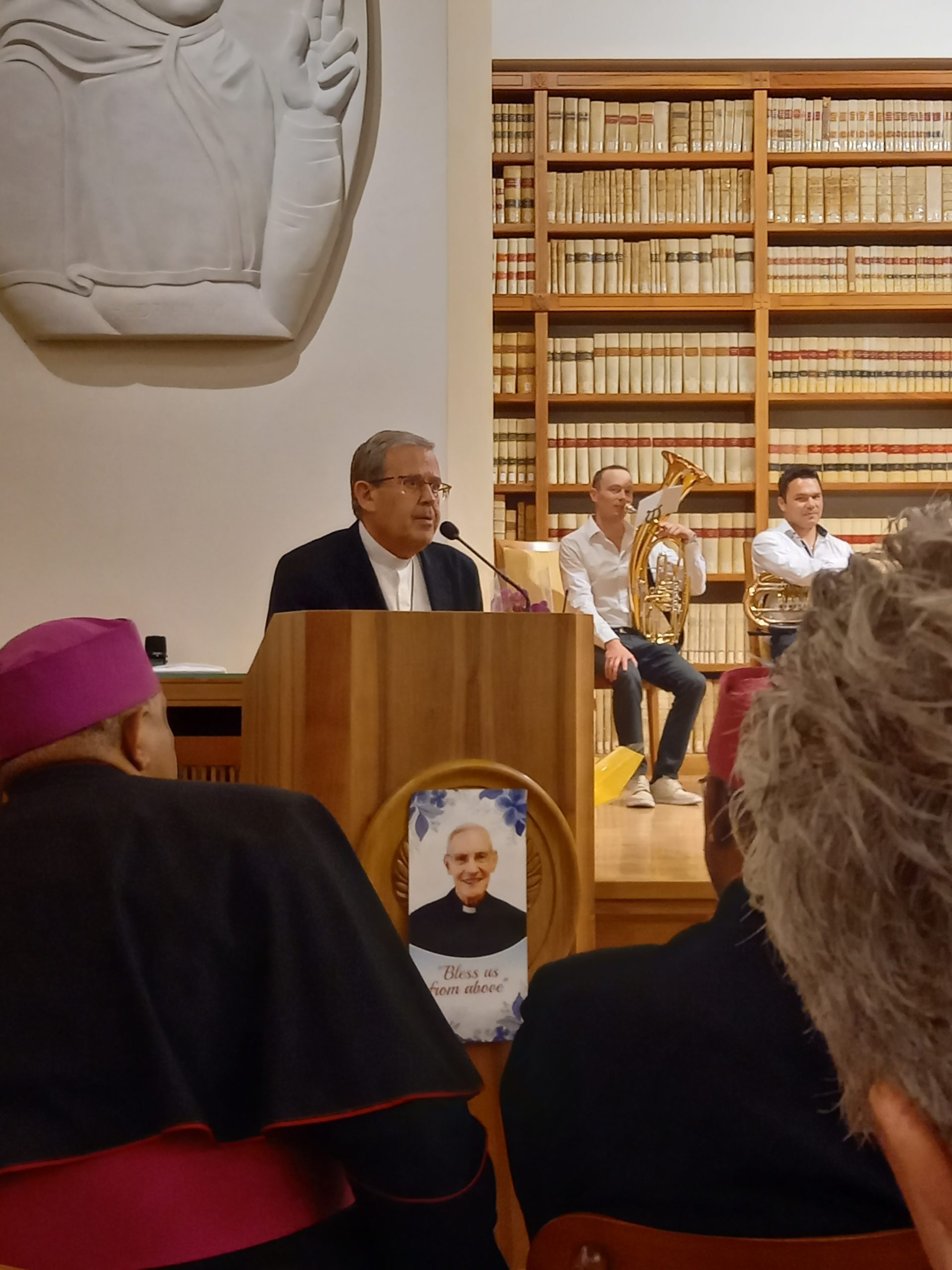 Im Anschluss fand in der beeindruckenden Bibliothek der Anima der Festakt zum Jubiläum statt. Fanfaren der Bläser lockerten die zahlreichen Reden und Videovorführungen auf, in denen das Wirken des aus Kartitsch stammenden Missionars Len Kofler gezeigt und gewürdigt wurde. Für das weitere Bestehen des Instituts sind die Hoffnungen auf den Orden der Salesianer gerichtet, dessen Generaloberer, Don Fabio Attard, den Festgottesdienst zelebrierte und auch beim Festakt sprach. Auch der Festakt kann im Internet noch gesehen werden: https://www.youtube.com/live/r3N7-ydbyvw