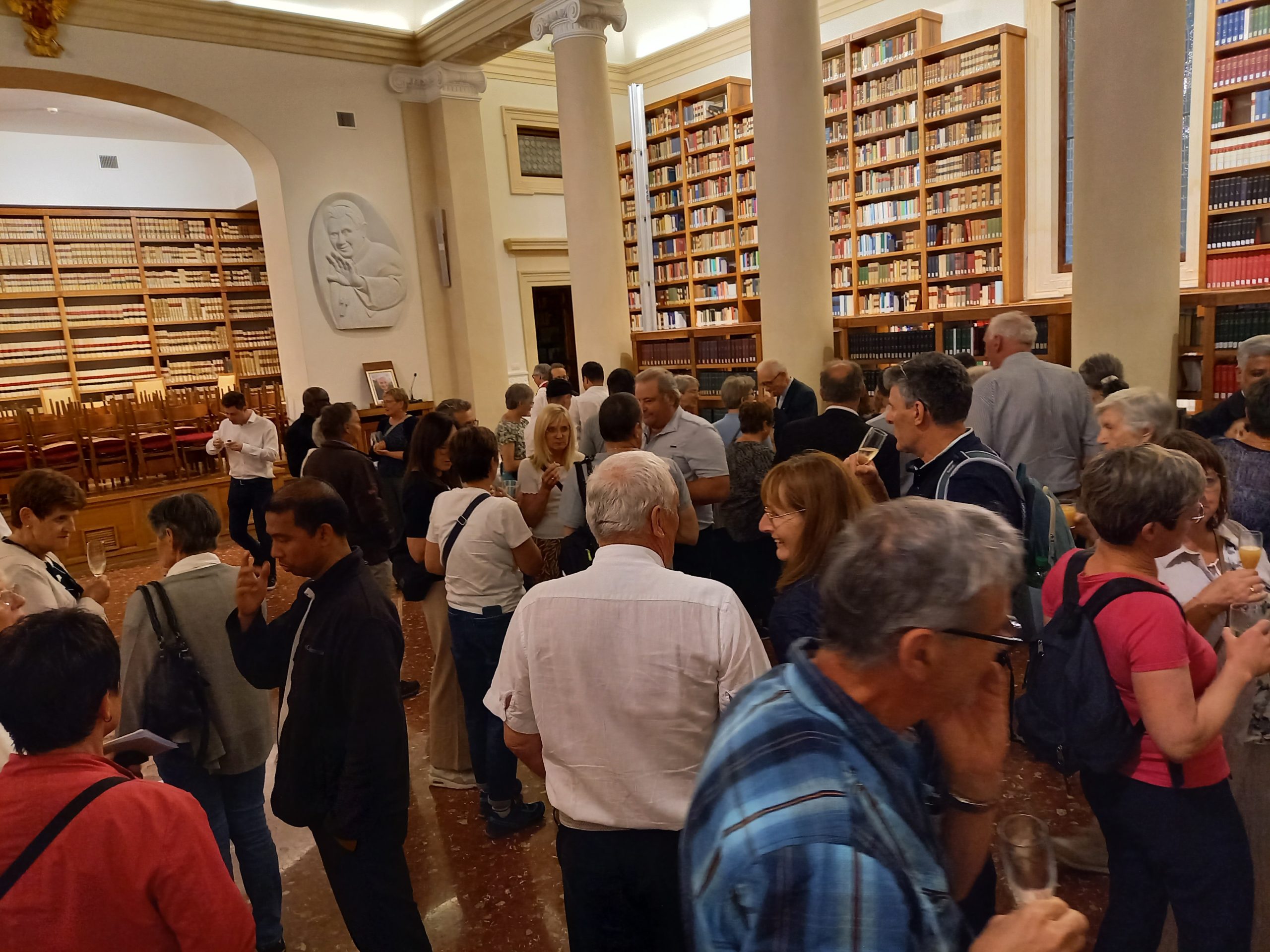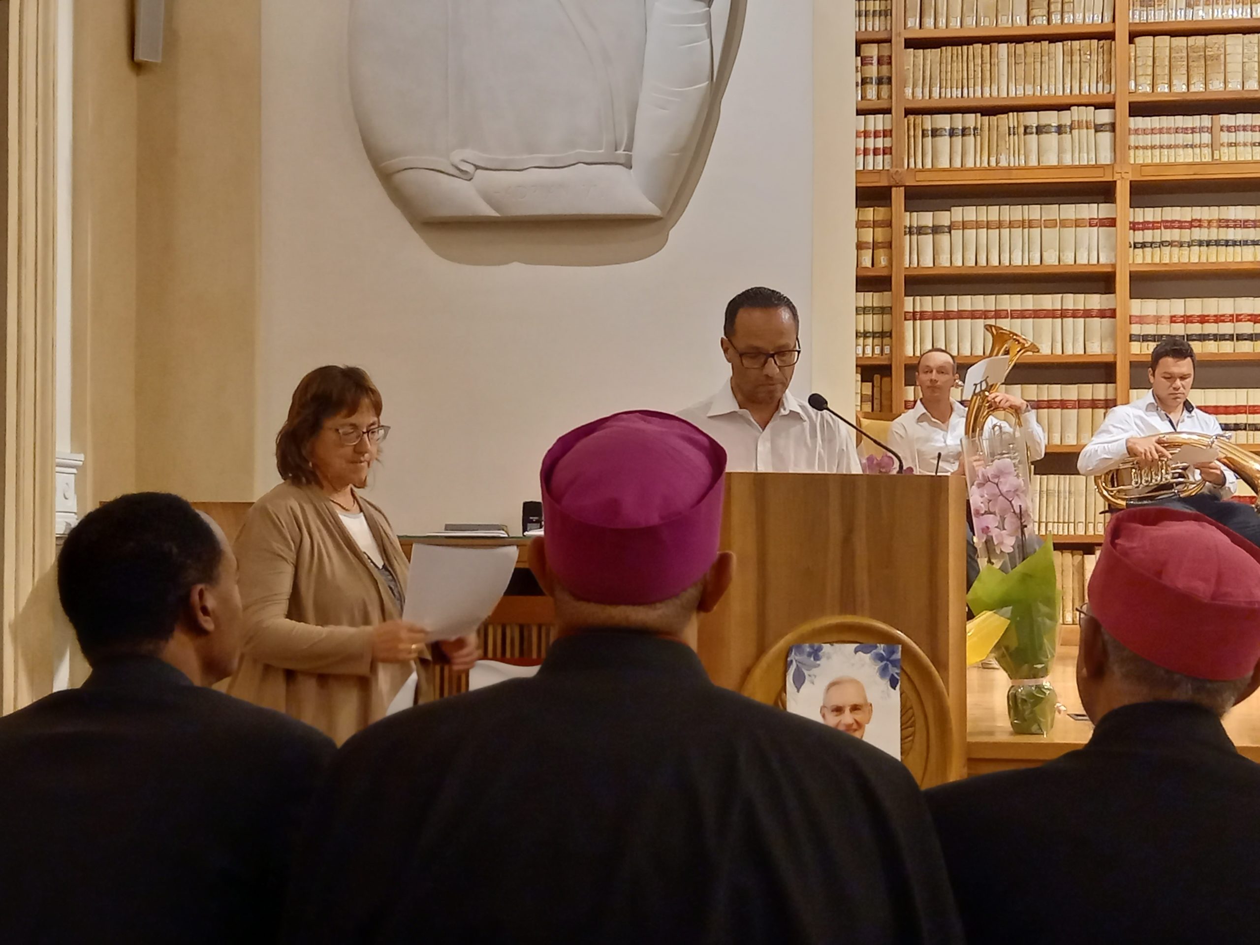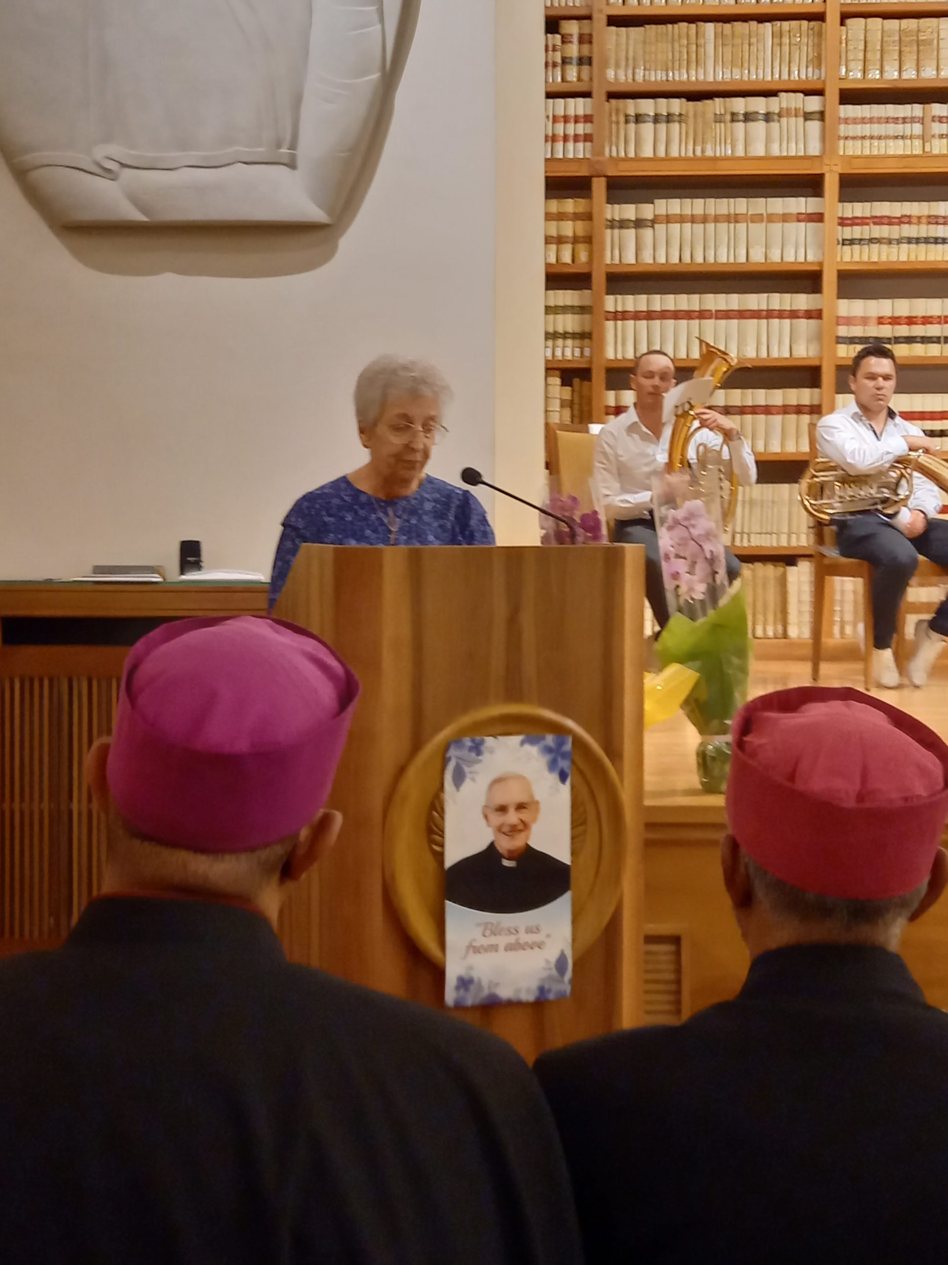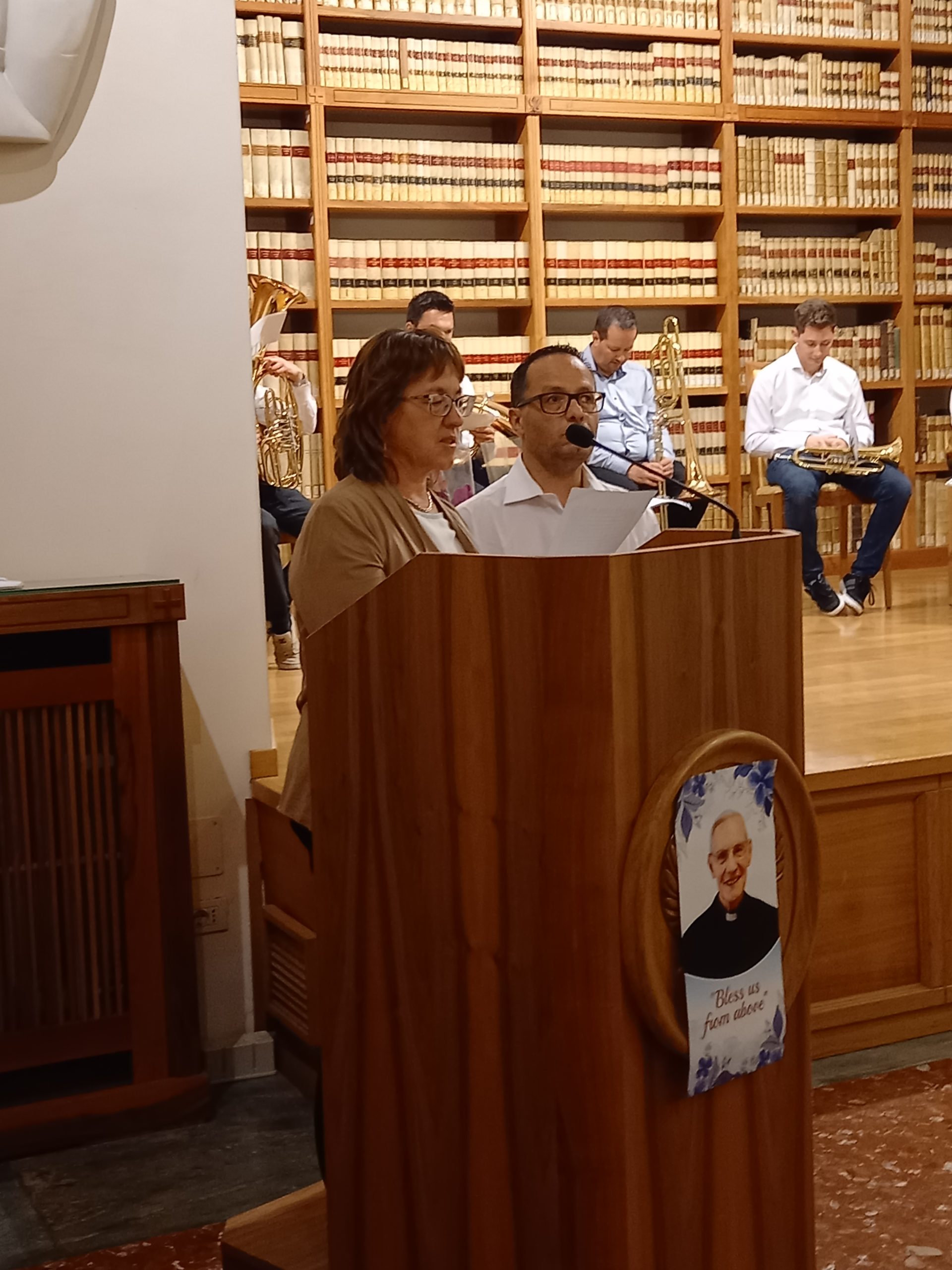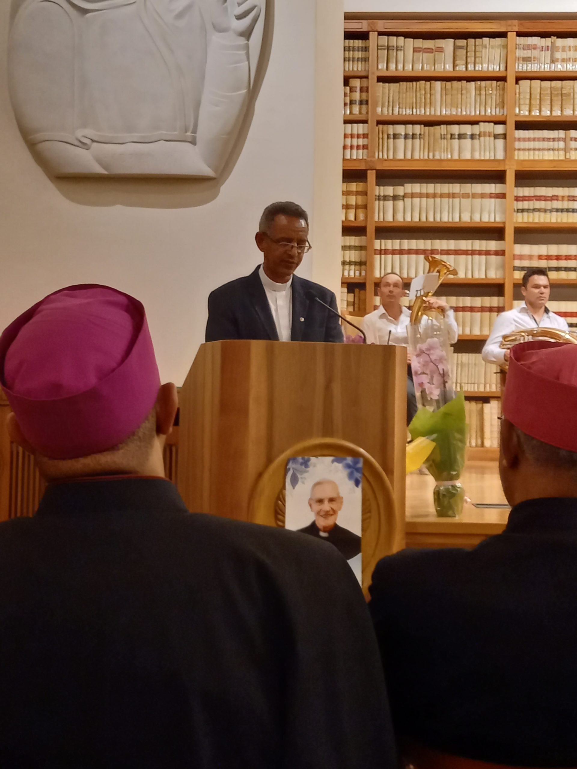 Im Anschluss fand in der beeindruckenden Bibliothek der Anima der Festakt zum Jubiläum statt. Fanfaren der Bläser lockerten die zahlreichen Reden und Videovorführungen auf, in denen das Wirken des aus Kartitsch stammenden Missionars Len Kofler gezeigt und gewürdigt wurde. Für das weitere Bestehen des Instituts sind die Hoffnungen auf den Orden der Salesianer gerichtet, dessen Generaloberer, Don Fabio Attard, den Festgottesdienst zelebrierte und auch beim Festakt sprach. Auch der Festakt kann im Internet noch gesehen werden: https://www.youtube.com/live/r3N7-ydbyvw