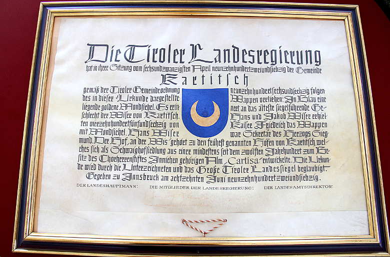 Das Wappen erinnert an das älteste siegel- und wappenführende Geschlecht der Gemeinde, die Wiser von Kartitsch. 1465 verlieh Kaiser Friedrich III. Hans und Jakob Wiser das Wappen mit der Mondsichel.