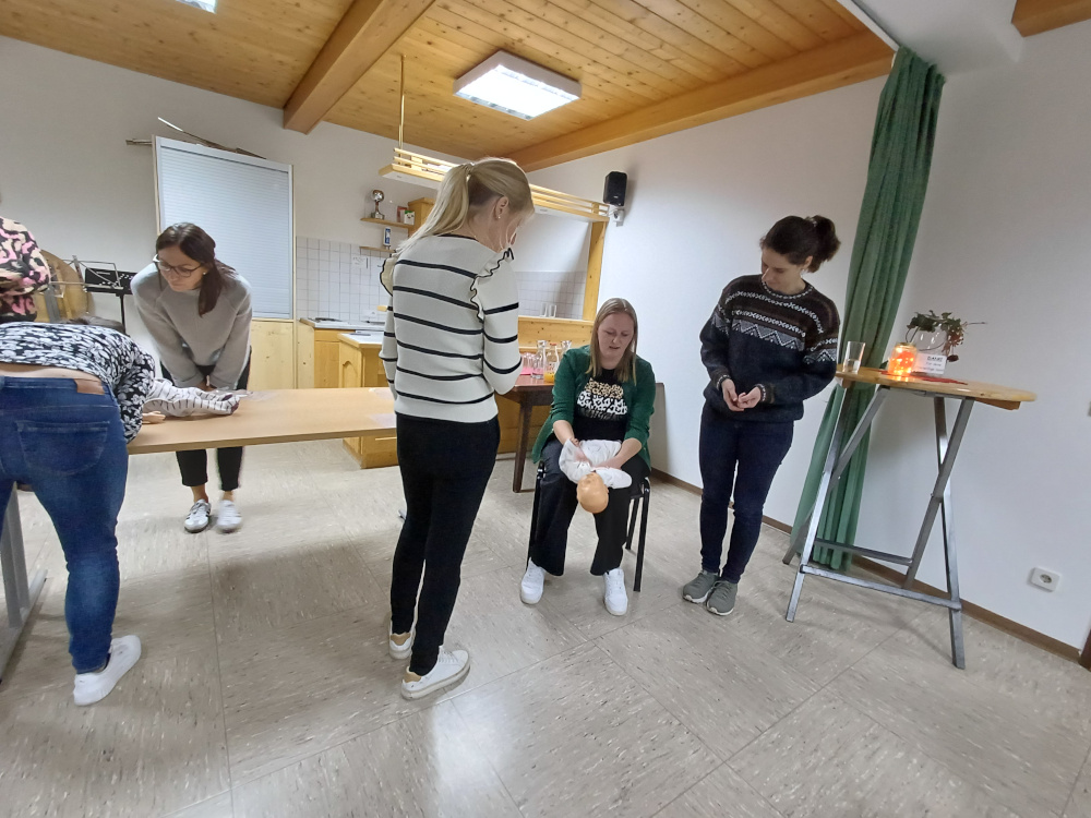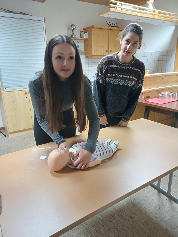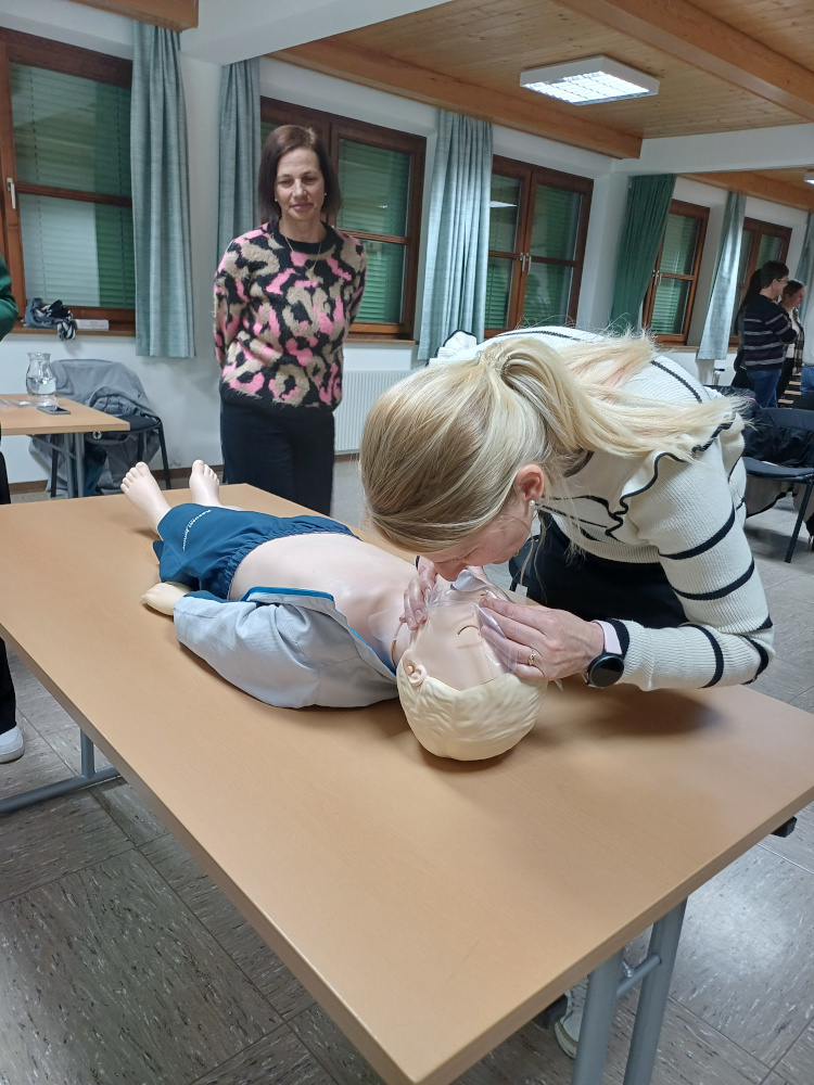 Die Zuhörerinnen erhielten wertvolle Tipps und Informationen, wann Hausmittel ausreichen und wann unbedingt ärztliche Hilfe nötig ist. Ein weiterer wichtiger Schwerpunkt war das Erste-Hilfe-Verhalten bei Fremdkörpern in den Atemwegen sowie die Kinderreanimation bei Atem- und Kreislaufstillstand. Wie erkenne ich ob ein Kind sich „nur“ verschluckt hat, oder ob es tatsächlich keine Luft mehr bekommt? Welche gezielten Handgriffe setzt man im Ernstfall um die Atemwege wieder frei zu machen ohne große Folgeverletzungen zu verursachen? Gilt bei Kindern der gleiche Reanimationszyklus wie bei Erwachsenen? Diese und noch einige andere Fragen wurden von den beiden EPALS-Instruktorinnen praxisnah erklärt und beantwortet. Nach dem theoretischen Teil konnten alle die Herzdruckmassage sowie Beatmung speziell für Säuglinge und Kleinkinder an Übungspuppen üben. Die Kursleiterinnen betonten immer wieder, dass rasches überlegtes Handeln im Notfall Leben retten kann. Während des gesamten Abends herrschte reges Interesse und es fand ein lebhafter Austausch untereinander statt.