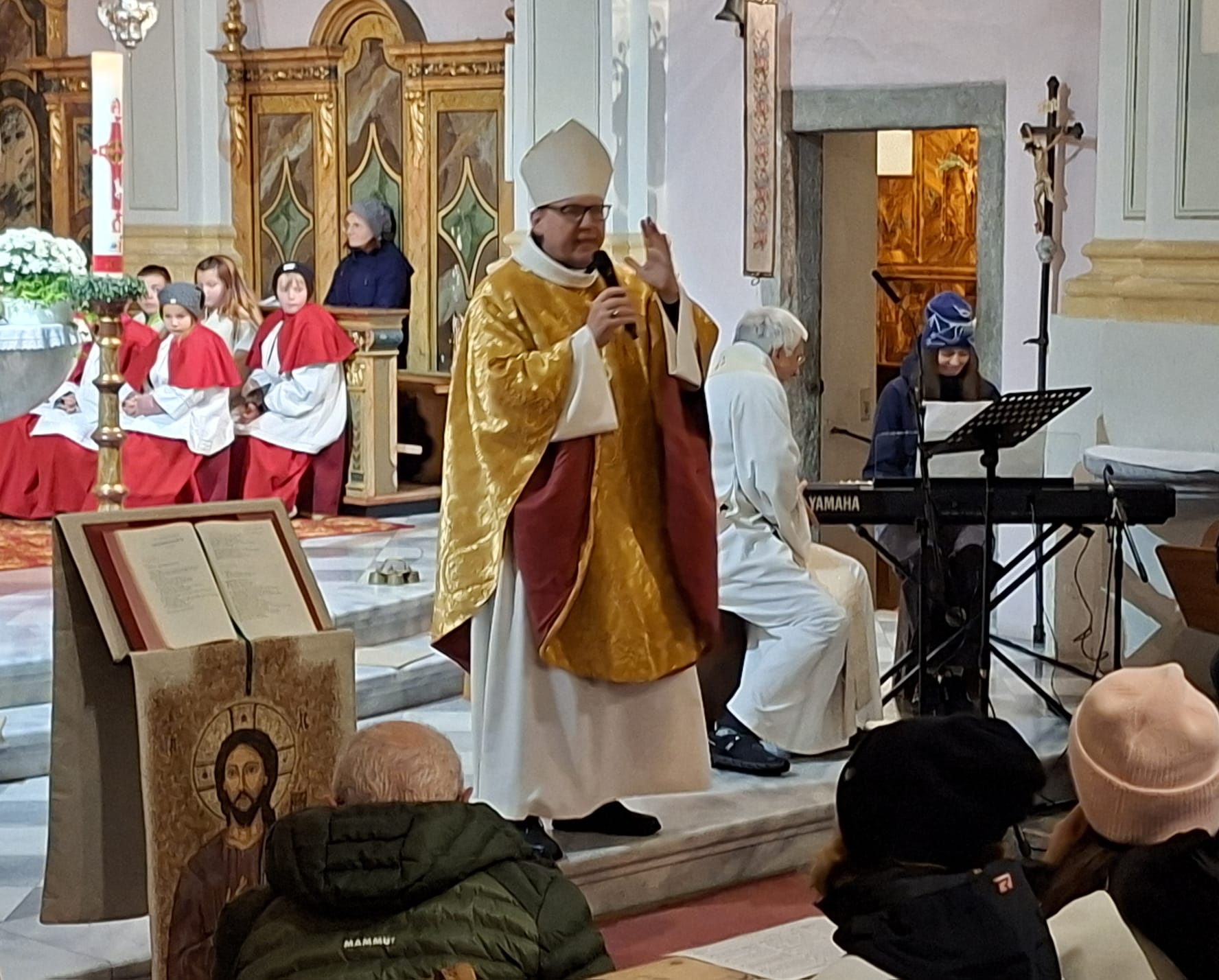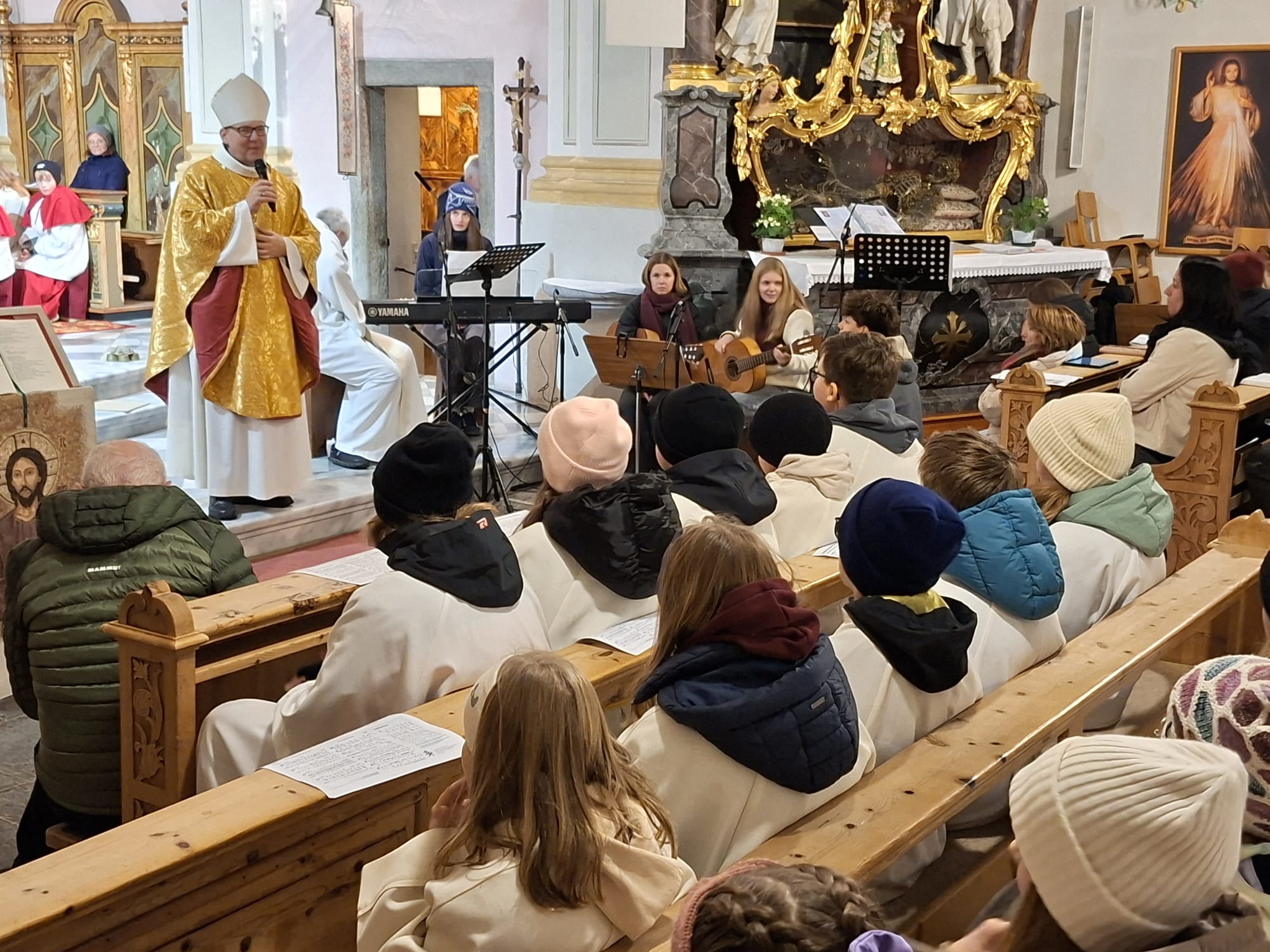 Nun schlüpften alle Minis in ihr „Arbeits- und Festtagsgewand“ und marschierten in einer langen Prozession zur Kirche von Sillian, begleitet von unserem Herrn Bischof, Herrmann Glettler, Dekan Hansjörg Sailer, Pfarrer Paul Salamon und Pfarrer Heritier. In der Kirche wurden wir mit flotter, rhythmischer Musik empfangen. Gestaltet wurde der Gottesdienst vom überaus musikalischen Pfarrer Andreas Schätzle mit einer Instrumentalgruppe aus Innervillgaten. Während der Messfeier trugen junge Leser:innen aus verschiedenen Pfarren Texte vor.