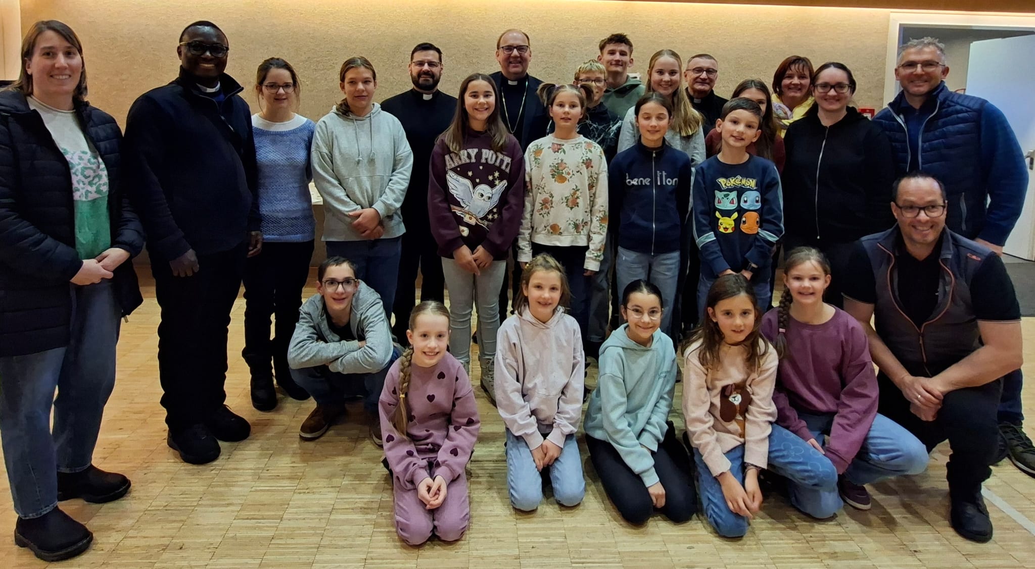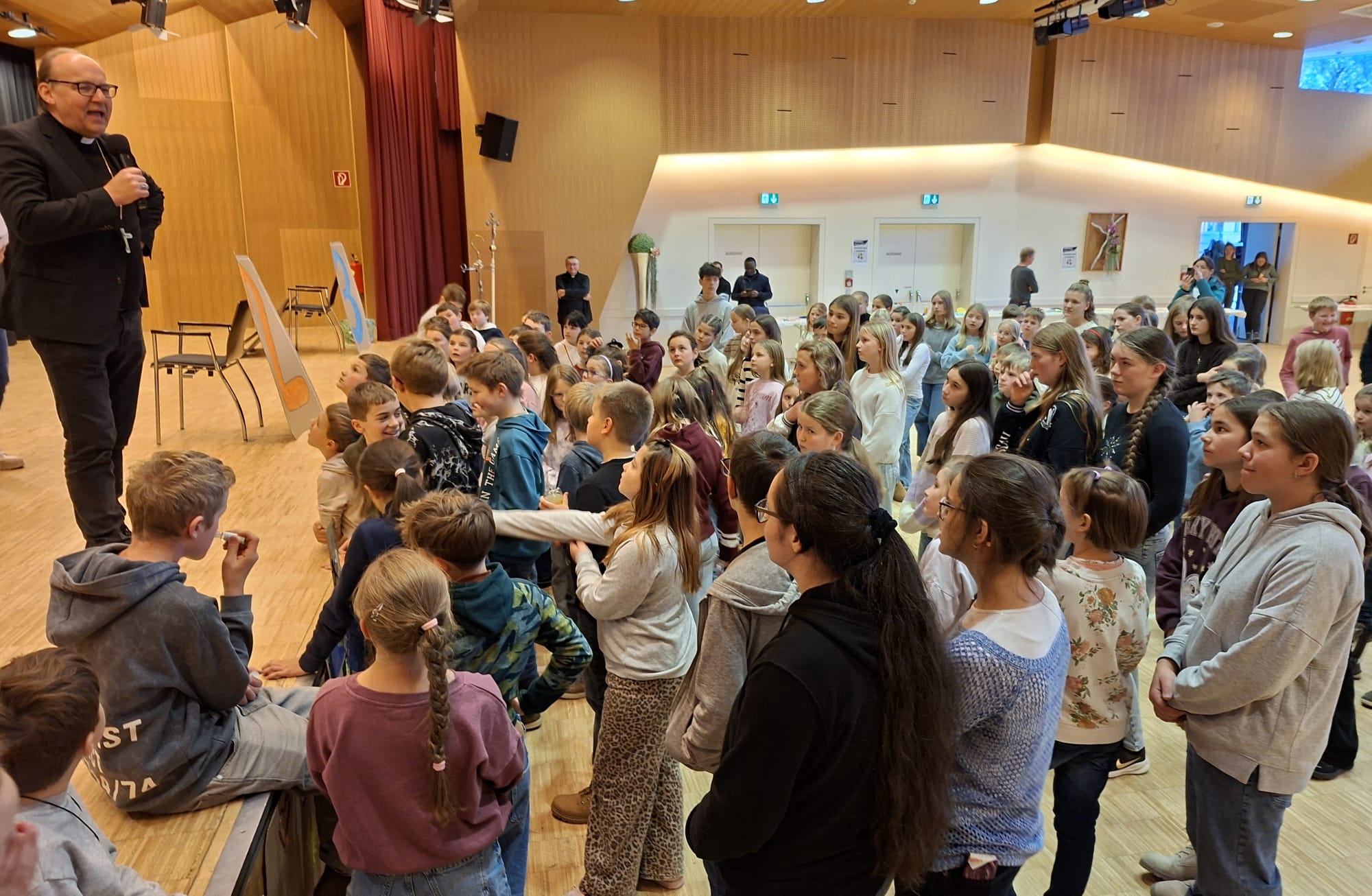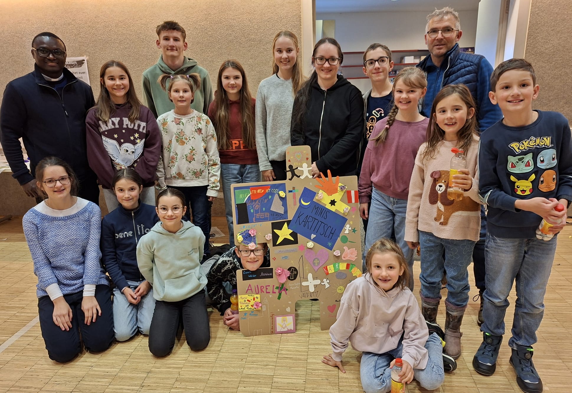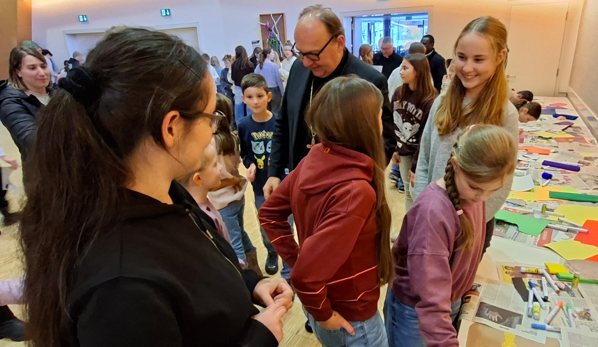 Bis 15 Uhr „trudelten“ alle im Kultursaal ein und begannen sogleich, ein Plakat in Form eines Riesenpuzzles zu gestalten. Buben und Mädchen waren eifrig bei der Arbeit. Als Bischof Hermann den Saal betrat, wurde er freundlich begrüßt und sogleich gebeten, mit jeder Ministrant:innengruppe ein Foto zu machen. Schließlich wurden alle Gruppen mit Puzzle zur Bühne gebeten und vorgestellt.