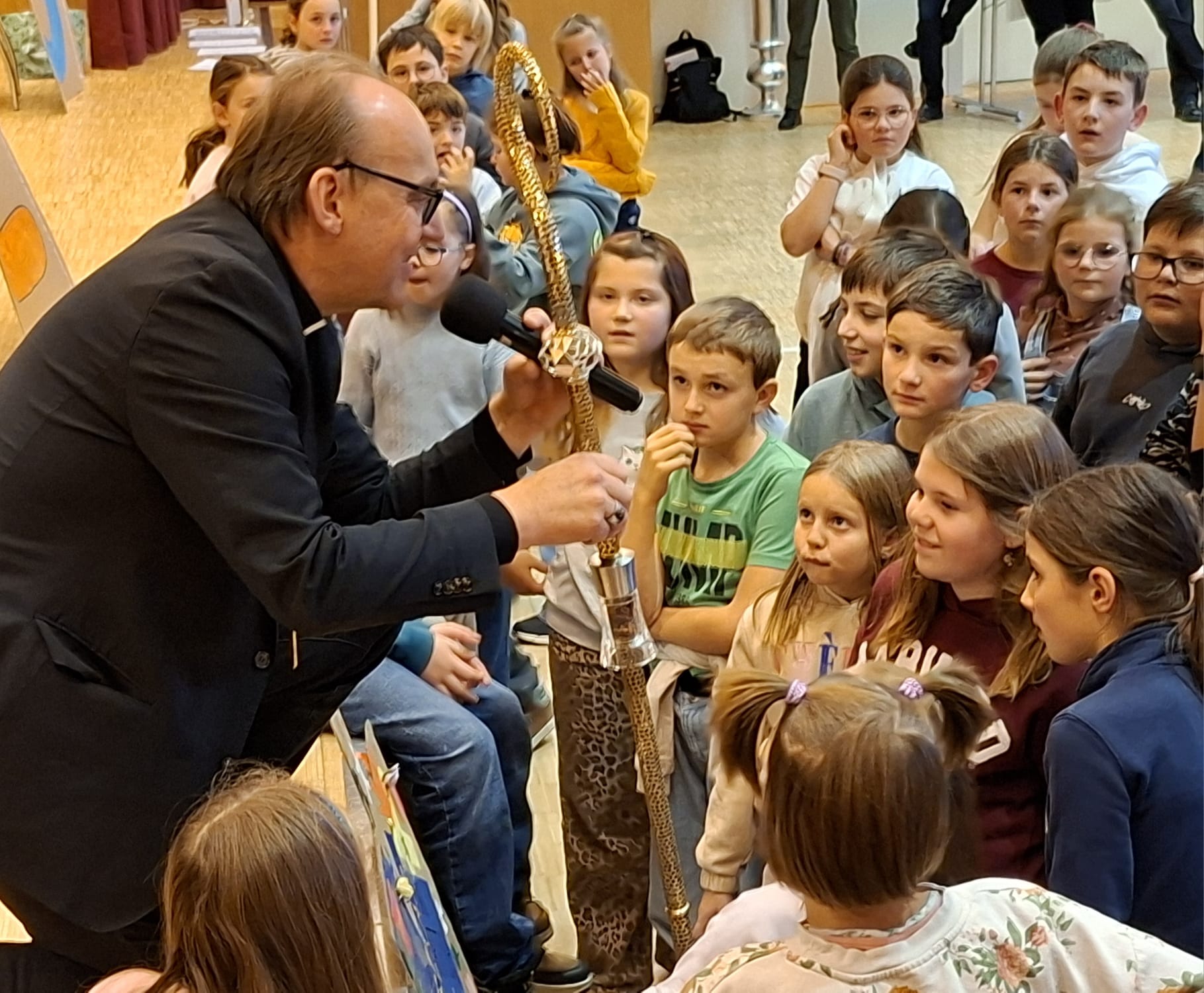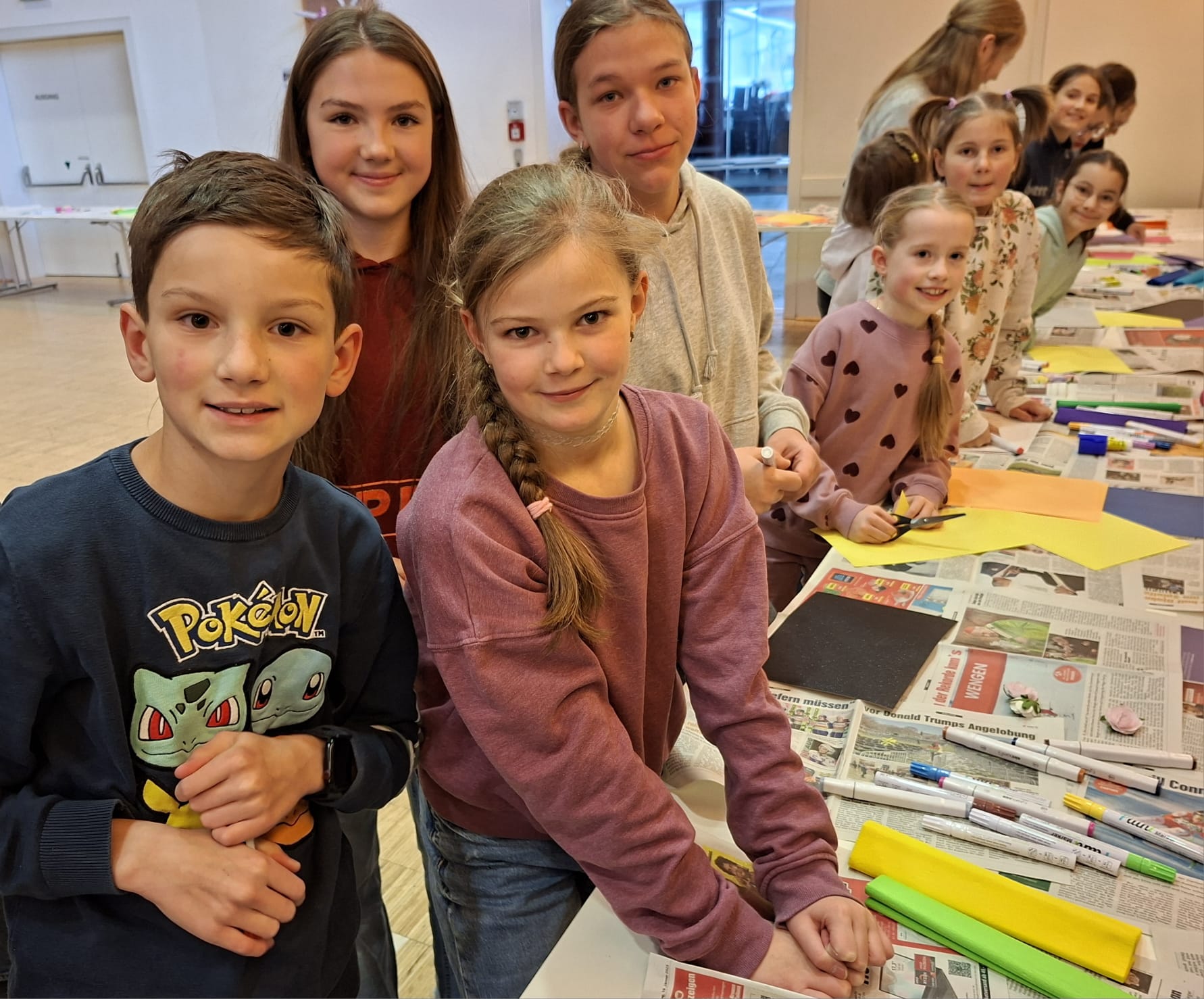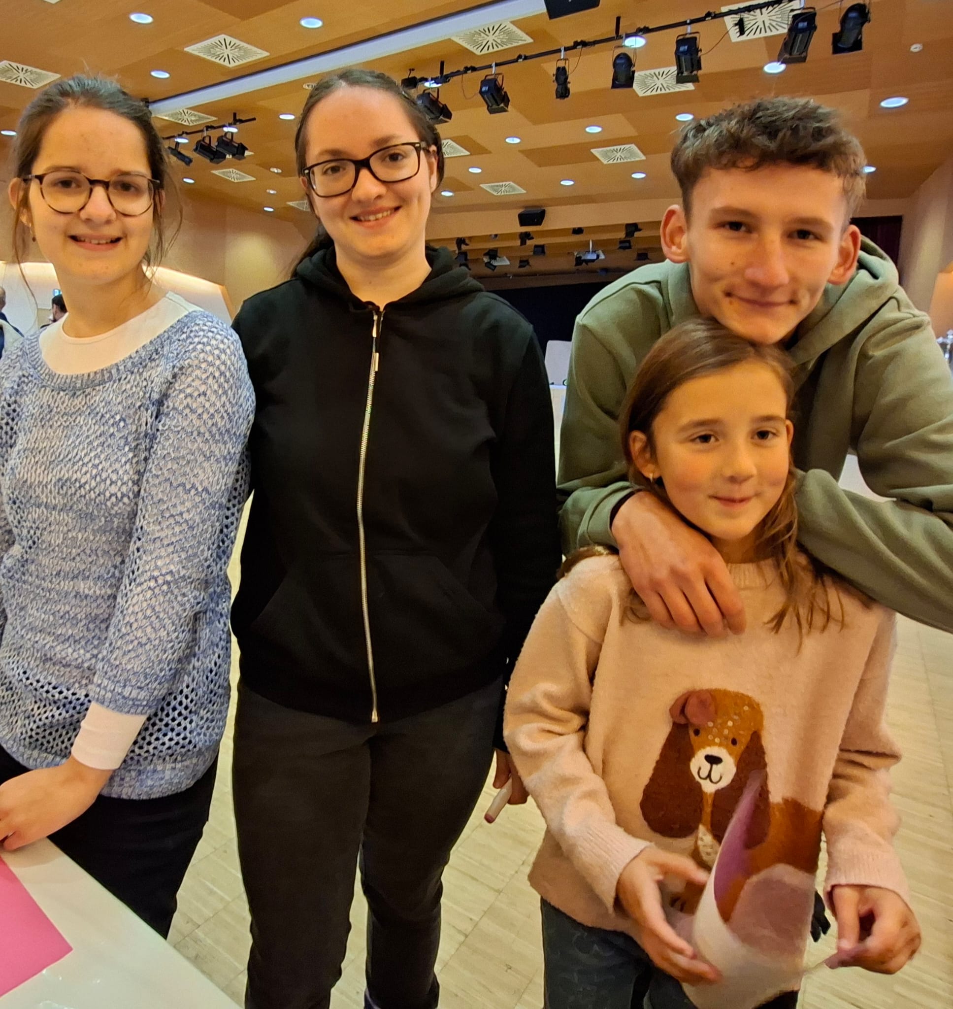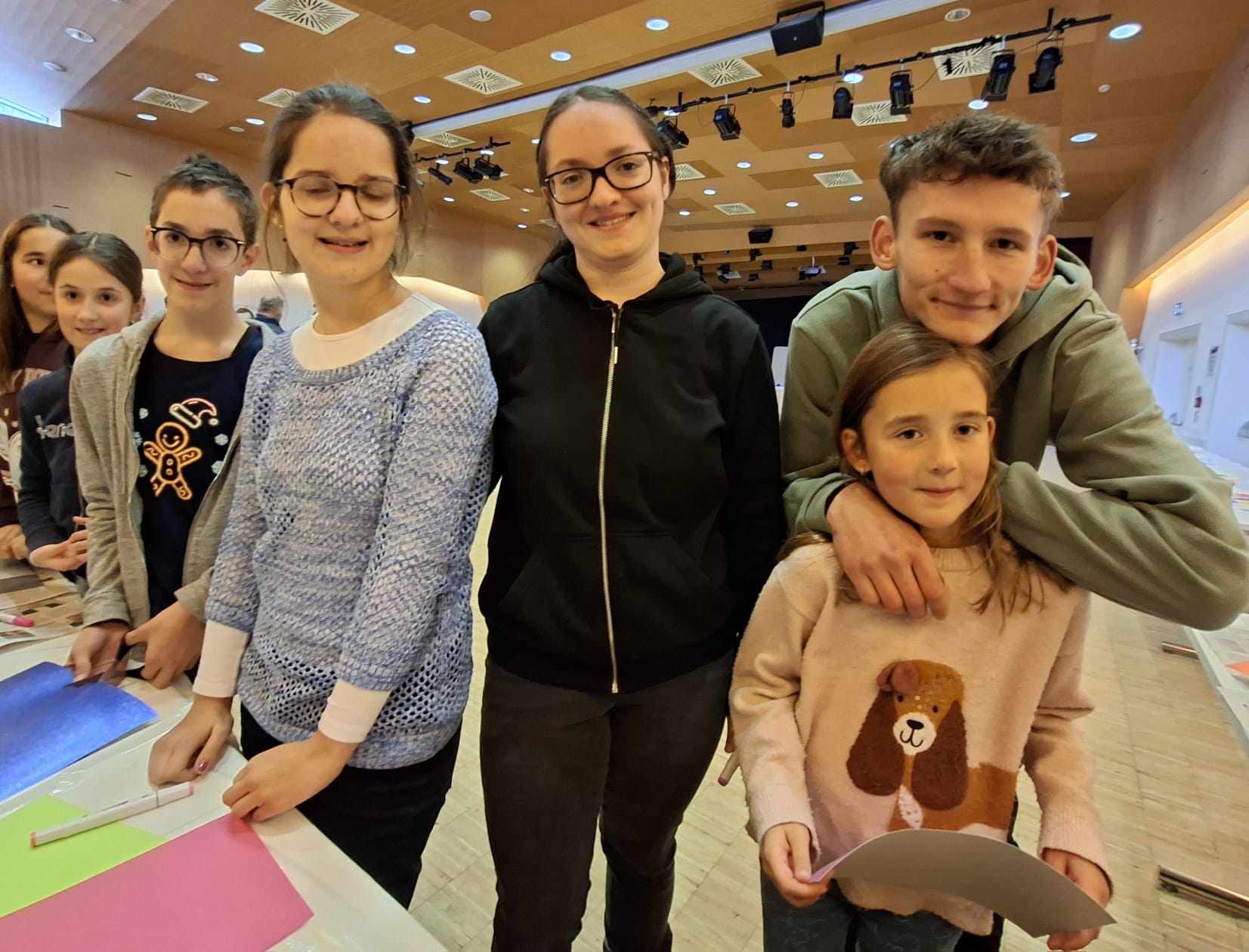 Bis 15 Uhr „trudelten“ alle im Kultursaal ein und begannen sogleich, ein Plakat in Form eines Riesenpuzzles zu gestalten. Buben und Mädchen waren eifrig bei der Arbeit. Als Bischof Hermann den Saal betrat, wurde er freundlich begrüßt und sogleich gebeten, mit jeder Ministrant:innengruppe ein Foto zu machen. Schließlich wurden alle Gruppen mit Puzzle zur Bühne gebeten und vorgestellt.